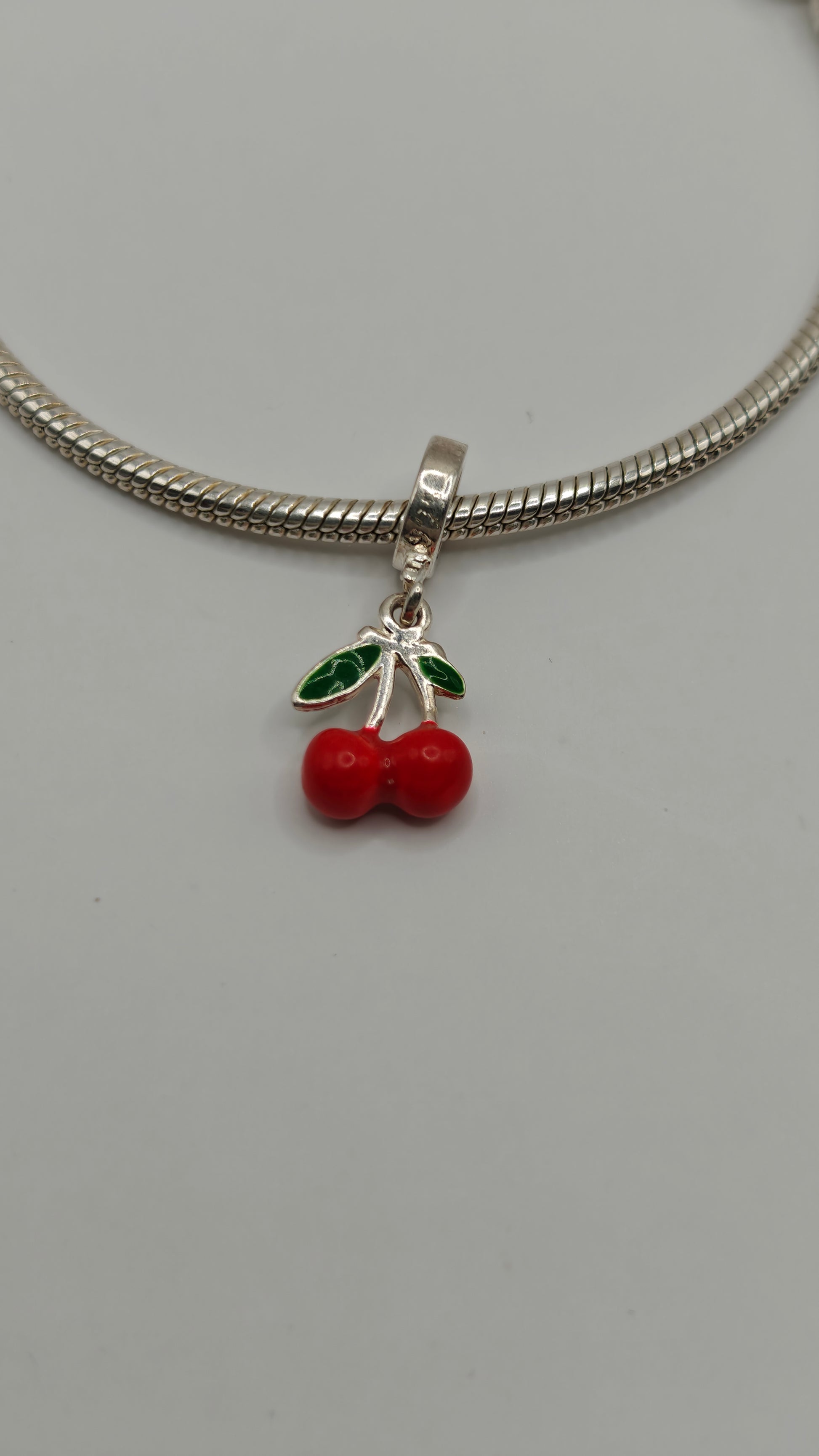Sweet and elegant, this Silver Cherry Charm brings a touch of playful sophistication to any jewelry piece. Expertly crafted from high-quality sterling silver, it features two perfectly sculpted cherries joined by a delicate stem and leaf, symbolizing love, luck, and vitality. The smooth, mirror-like finish catches the light beautifully, creating a subtle shine that enhances its timeless appeal. Whether worn on a bracelet, necklace, or anklet, this charm adds a hint of charm and freshness — a perfect piece for those who love nature-inspired elegance with a modern twist.